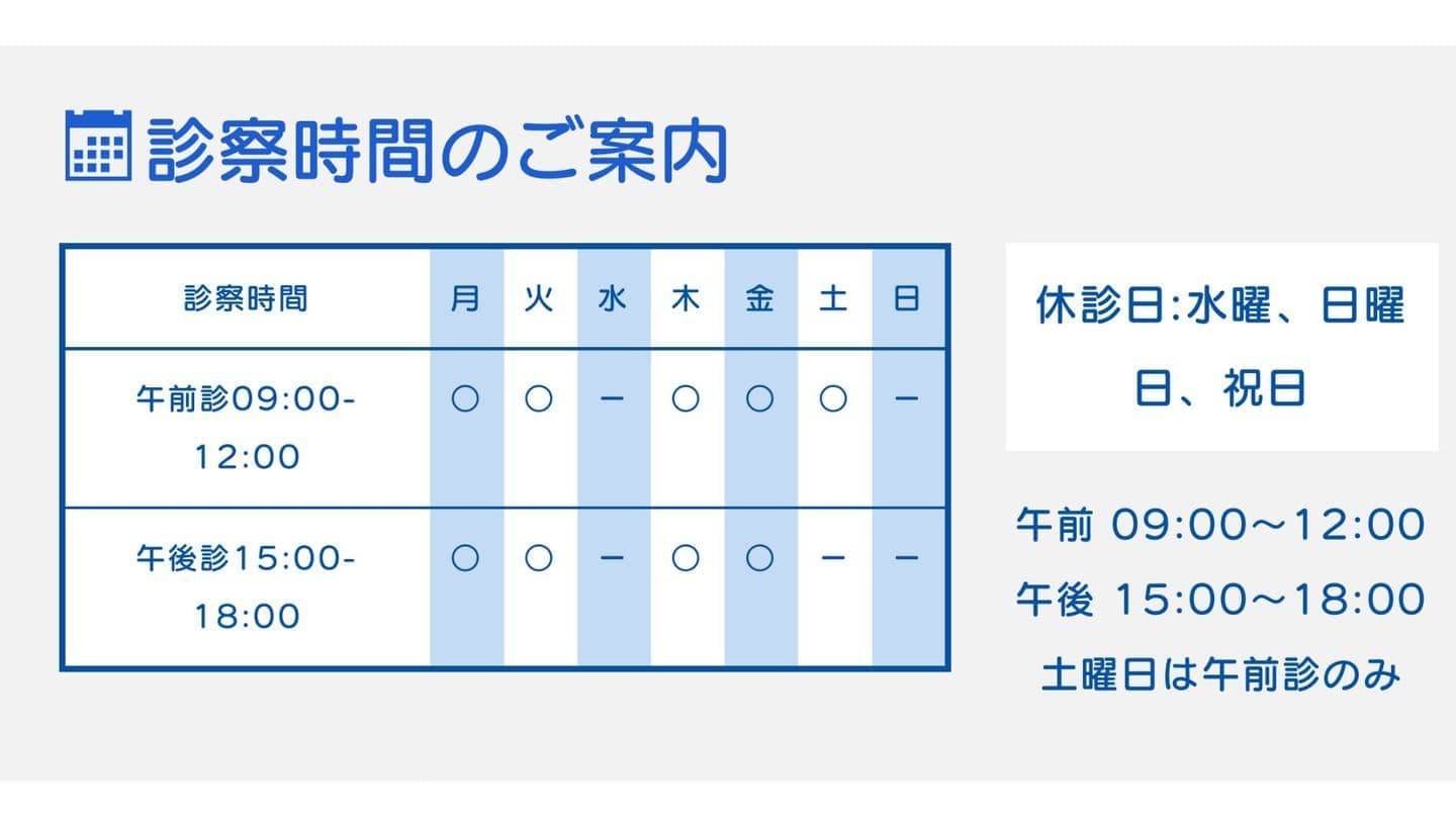 | 午前診09:00-12:00 | ○ | ○ | ー | ○ | ○ | ○ | ー |