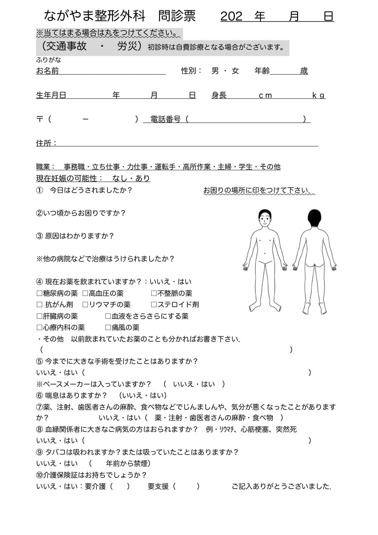 初めてお越しの方は、問診票.pdfをクリックし、画像を保存、プリントアウトしてご記入いただき、受付にお出し下さい.